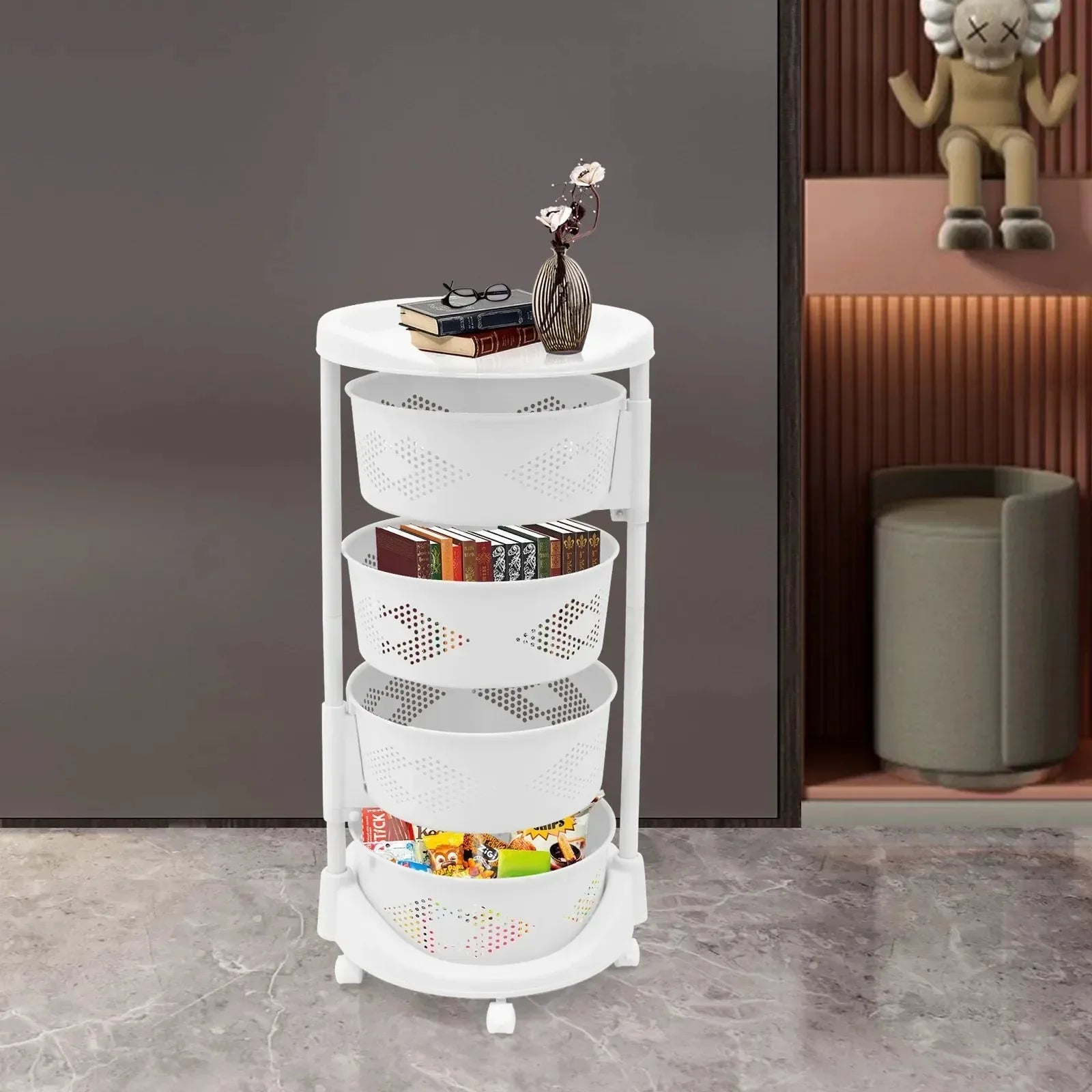 Do you suffer from desktop clutter? This 4-tier rotating storage rack can help you solve that problem. The combination of high-quality PP and iron with a painting process makes it sturdy and durable. 4 large baskets and top storage space can meet your storage needs. 5 universal wheels are convenient for you to move this product from one room to another. With it, your home will become more tidy.