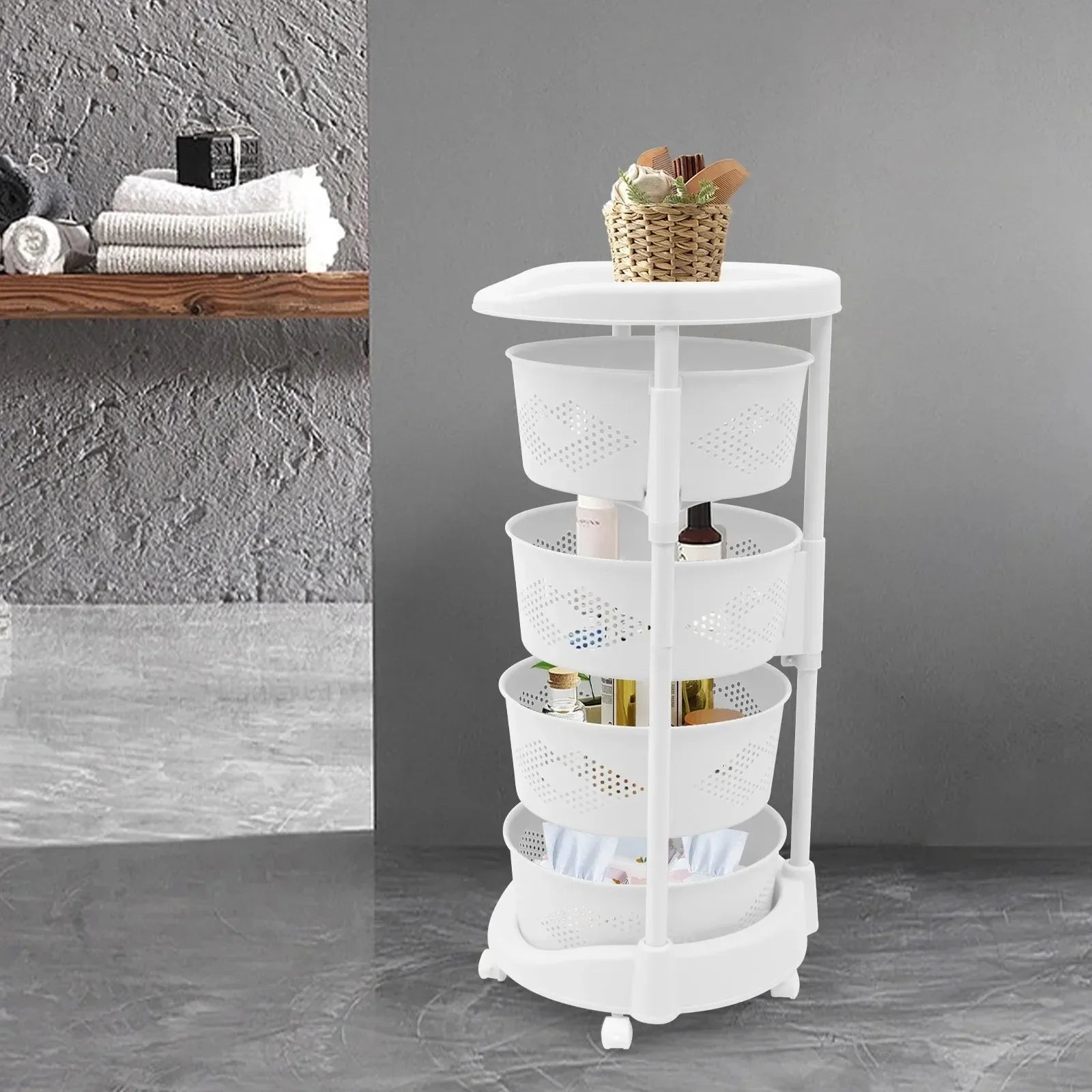 Storage Assistant: The round top platform and 4 large-capacity baskets allow you to easily place and access various items such as fruits, vegetables, towels, and wash supplies (not included), making full use of vertical space and keeping items neatly organized.